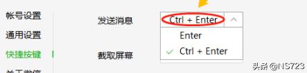 在设置窗口的"快捷按键"里,我们将发送消息设置成"Ctrl+Enter",然后系统就会自动将enter键调整为换行,见下图